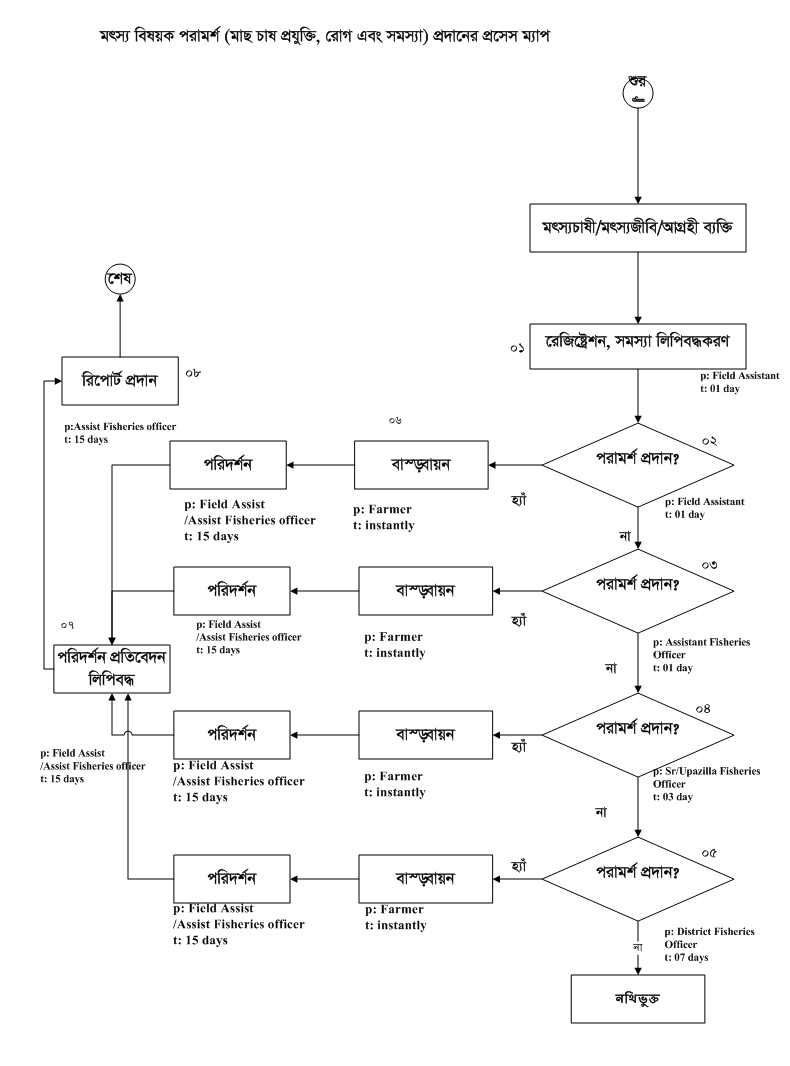 | ৪ | মৎস্য বিষয়ক পরামর্শ (মাছ চাষ প্রযুক্তি, রোগ এবং সমস্যা) প্রদান। | দেখুন | |